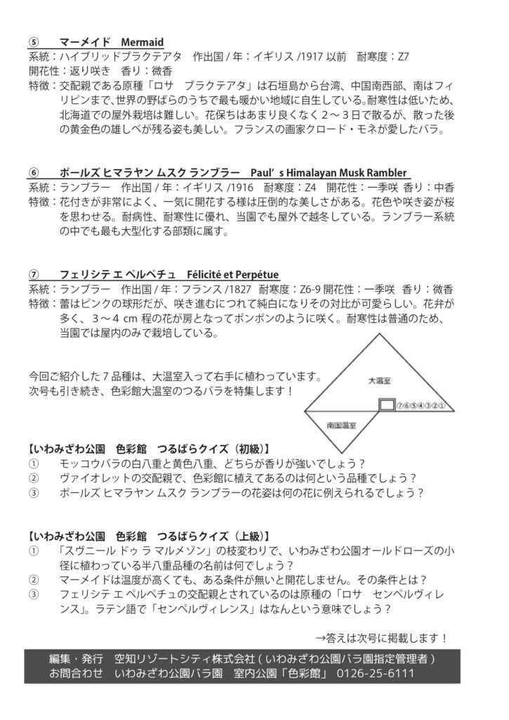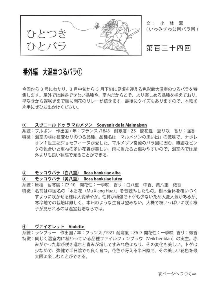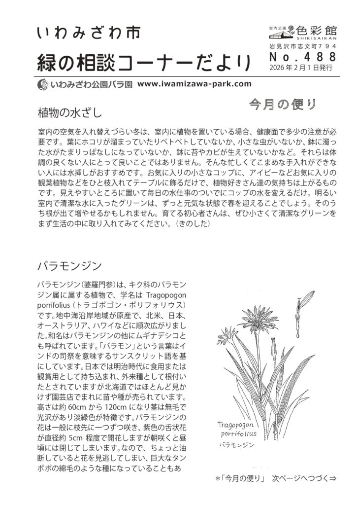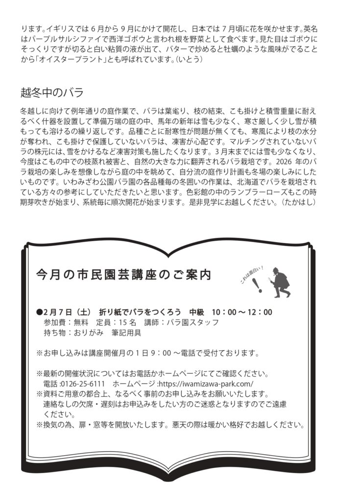2月の市民園芸講座のお知らせ&緑の相談コーナーだより 2026年2月1日 最終更新日時 : 2026年2月1日 山本 晶子 2月の市民園芸講座のお知らせ●2月7日(土) 10:00~12:00 折り紙でバラをつくろう 中級 料金:無料 定員:15名 講師:バラ園スタッフ 持ち物:おりがみ 筆記用具 ※最新の開催状況についてはお電話か当ホームページにてご確認ください。電話:0126-25-6111※換気の為、窓・扉等を開放いたします。暖かい格好でお越しください。※市民園芸講座のお申し込みは広報に掲載された月の1日9:00から受付を開始いたします。(例:4月号に掲載された講座であれば4/1から)※事前申し込み無しに当日に飛び入り参加される方は、定員制限などの関係から受講をお断りさせていただく場合がございます。連絡なしの欠席・遅刻は他にお申込みをしたい方のご迷惑となりますので、ご遠慮ください。※材料費のかかる講座は、講師の方の準備等の都合上、開催日3~4日前までにお申込みをお願いいたします。 緑の相談コーナーだより488号PDF 緑の相談コーナーだより2026.02-488号バックナンバーはこちら 緑の相談コーナーだより 緑の相談コーナーだより バックナンバー menu 2026年 No.487-2026.1.1発行.pdf No.488-2026.2.1発行.pdf No.489-2026.3.1発行.pdf No.490-2026.4 […] いわみざわ公園