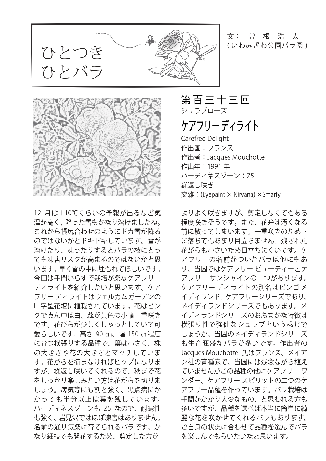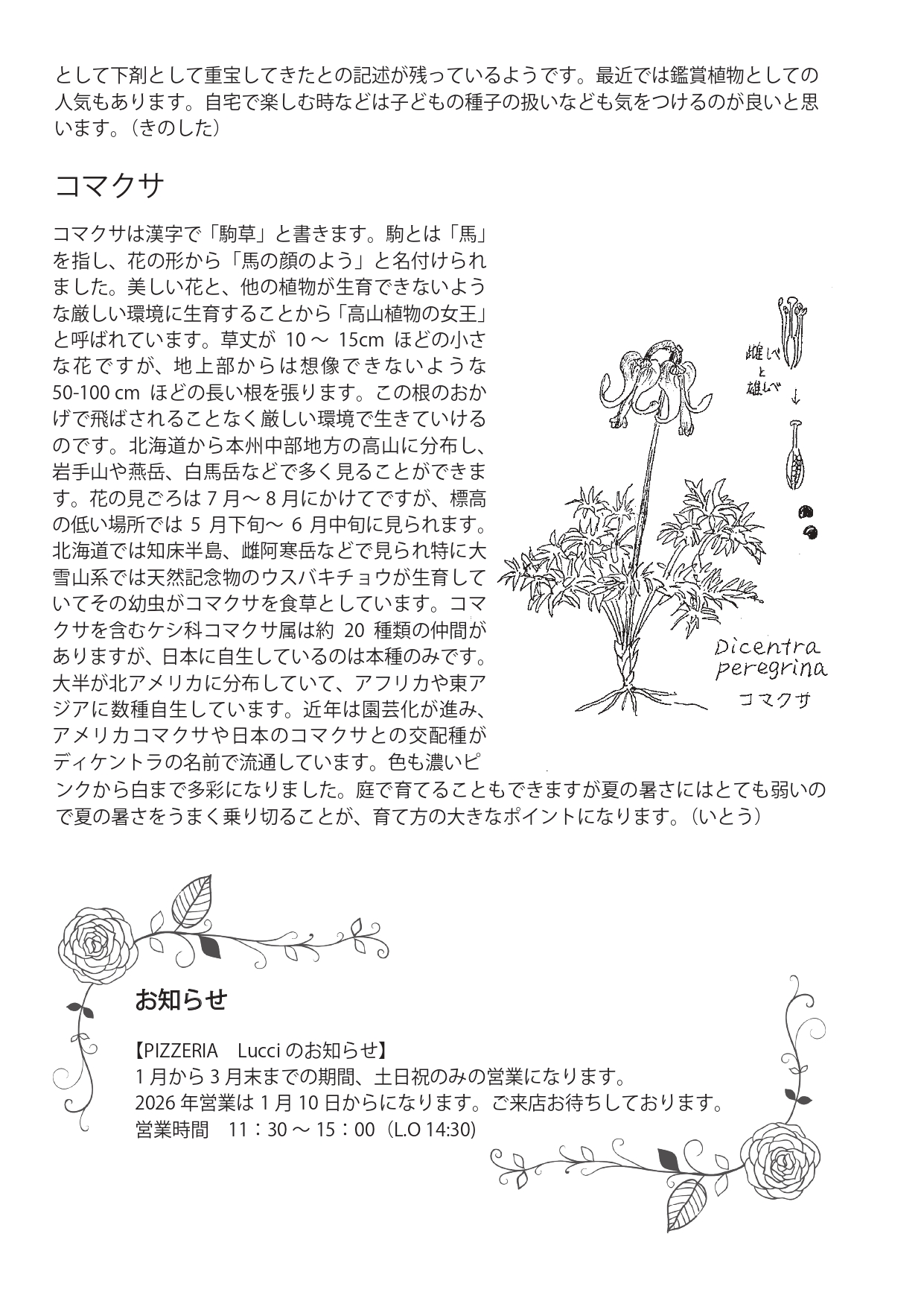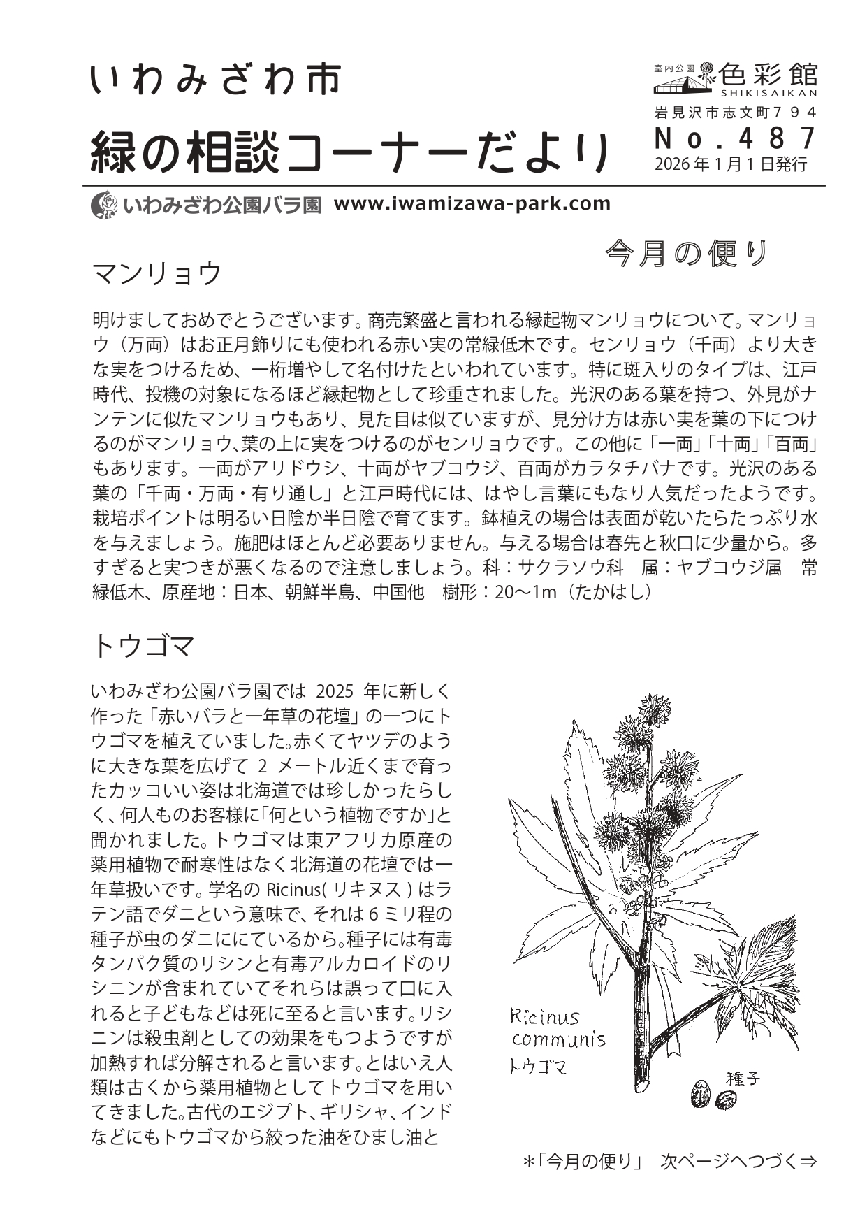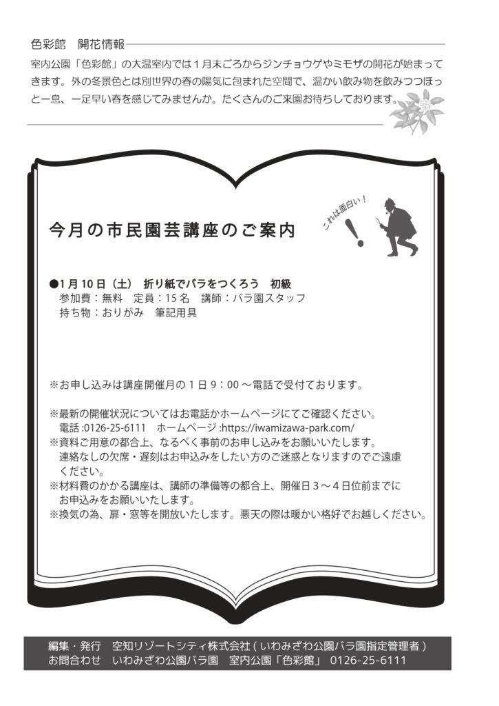 1月の市民園芸講座のお知らせ&緑の相談コーナーだより 2026年1月1日 最終更新日時 : 2025年12月31日 山本 晶子 1月の市民園芸講座のお知らせ●1月10日(土) 10:00~12:00 折り紙でバラをつくろう 初級 料金:無料 定員:15名 講師:バラ園スタッフ 持ち物:おりがみ 筆記用具 ※最新の開催状況についてはお電話か当ホームページにてご確認ください。電話:0126-25-6111※換気の為、窓・扉等を開放いたします。暖かい格好でお越しください。※市民園芸講座のお申し込みは広報に掲載された月の1日9:00から受付を開始いたします。(例:4月号に掲載された講座であれば4/1から)※事前申し込み無しに当日に飛び入り参加される方は、定員制限などの関係から受講をお断りさせていただく場合がございます。連絡なしの欠席・遅刻は他にお申込みをしたい方のご迷惑となりますので、ご遠慮ください。※材料費のかかる講座は、講師の方の準備等の都合上、開催日3~4日前までにお申込みをお願いいたします。 緑の相談コーナーだより487号PDF 相談コーナーだより2026-1-487号バックナンバーはこちら 緑の相談コーナーだより 緑の相談コーナーだより バックナンバー menu 2026年 No.487-2026.1.1発行.pdf No.488-2026.2.1発行.pdf No.489-2026.3.1発行.pdf No.490-2026.4 […] いわみざわ公園